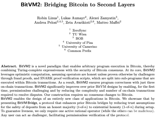 Bitcoin擴容解決方案Bitcoin虛擬機(BitVM)的開發團隊近日推出了新版本“BitVM2”及其配套工具BitVM Bridge,預計將為Bitcoin網絡帶來顯著的改進。