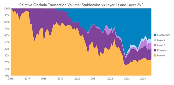 穩定幣是目前加密領域的“殺手級應用”。如今,市場上流通的穩定幣總值超過1600億美元,而在2020年,這一數值還僅為幾十億美元。每個月有超過2000萬個地址在公共Blockchain上進行穩定幣交易。僅在2024年上半年,穩定幣的結算金額就超過了2.6萬億美元。穩定幣相較于現有的支付系統具有顯著優勢:鏈上可編程性、強審計能力、交易即結算、資金自托管以及互操作性。
