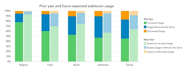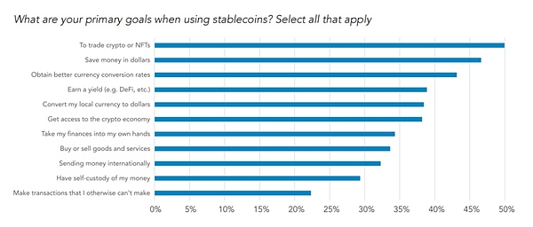 當被問及非加密的穩定幣活動時,最常見的使用場景是貨幣替代(69%),其次是支付商品和服務(39%)以及跨境支付(39%)。很明顯,在被調查的國家中,穩定幣已從單純的交易抵押品演變為普遍使用的數字美元工具。